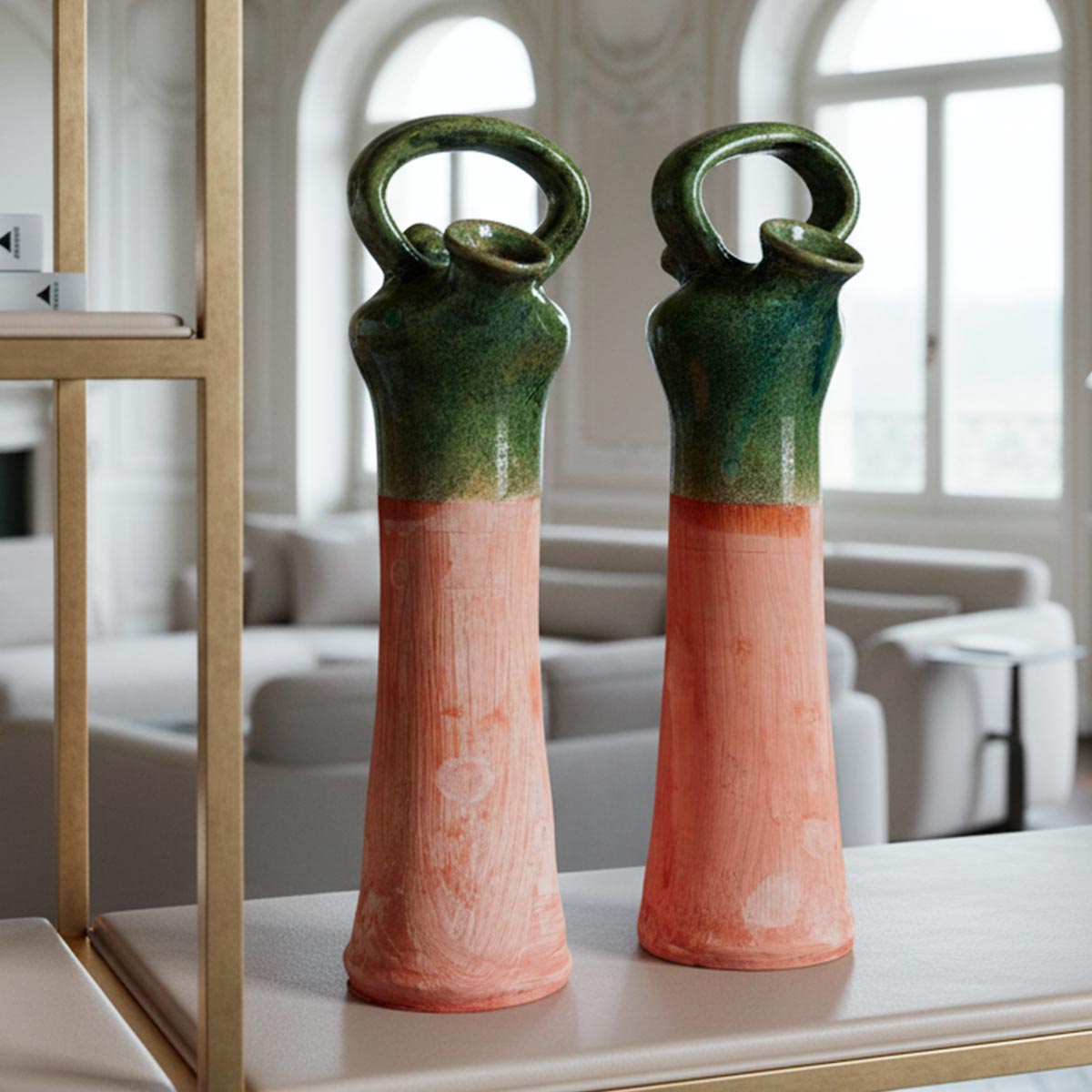 La sua silhouette slanciata è un dialogo tra due elementi, due anime: la base, in terracotta nuda, porosa e calda, che conserva l'eco primordiale della terra spagnola; e la sommità, vestita di uno smalto vitreo e profondo, un verde muschio che evoca uliveti secolari e calette nascoste. Questa non è la forma tradizionale del botijo, ma la sua evoluzione poetica. Liberato dalla sua funzione ancestrale, diventa una presenza scenica, un punto focale che abita uno spazio con la sua eleganza silenziosa.