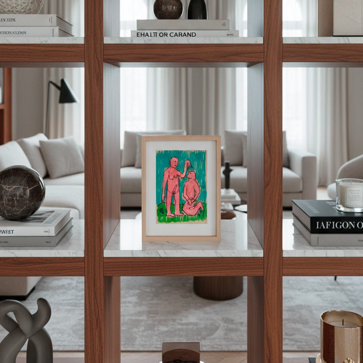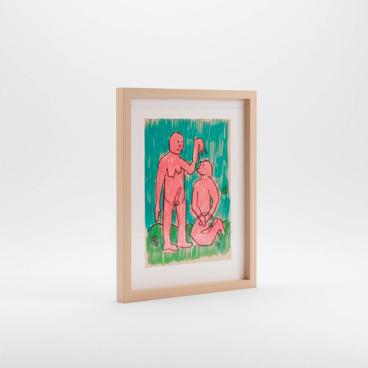 Un gesto antico, quasi sacrale, immobilizzato su carta dalla mano inconfondibile di Massimiliano Precisi. "Il Rito Sospeso" è un'opera che parla il linguaggio degli archetipi: due figure, rese nella loro essenza più pura attraverso un vibrante rosa carnale, si stagliano su un fondo verde smeraldo che richiama una natura primordiale.