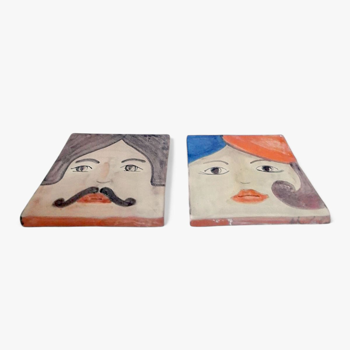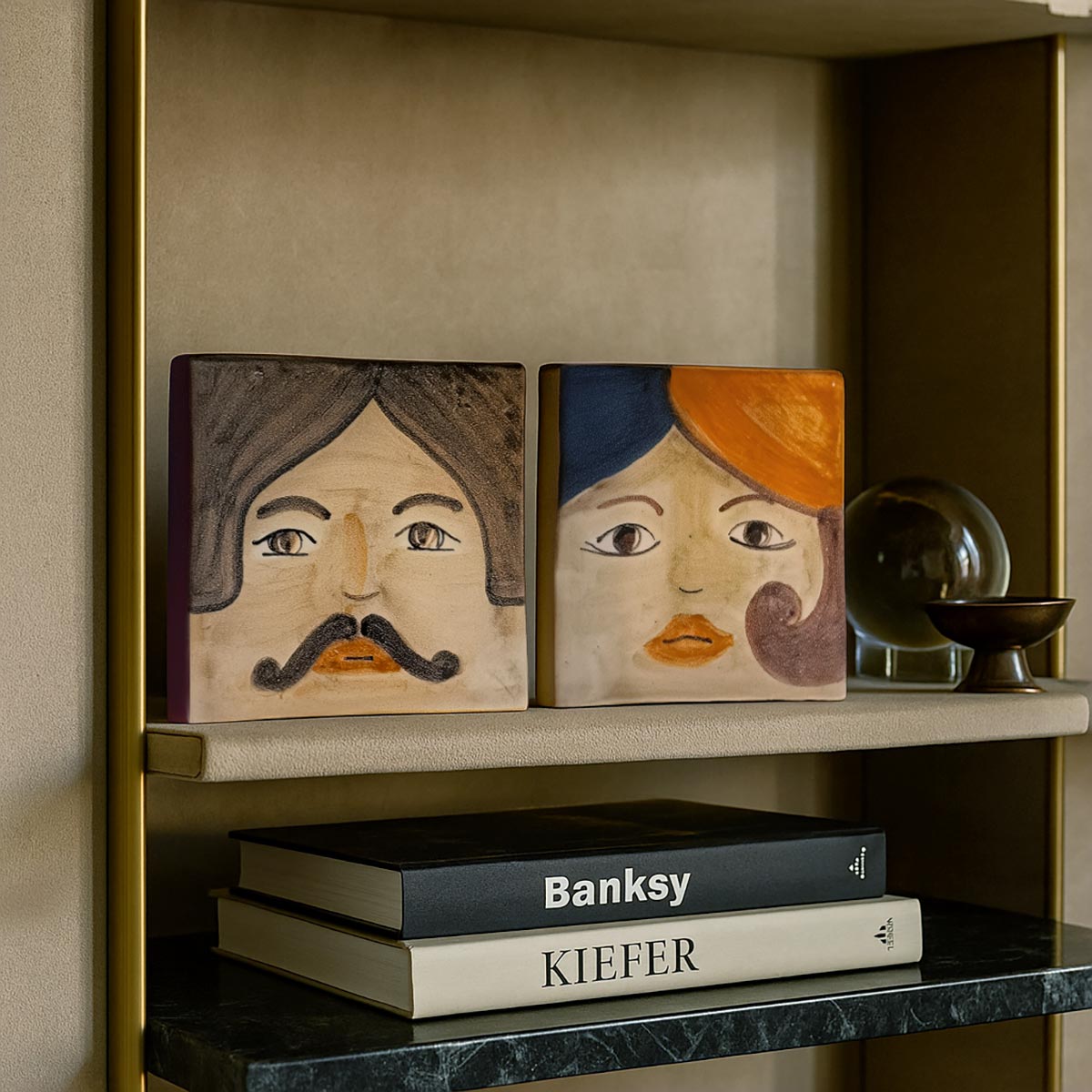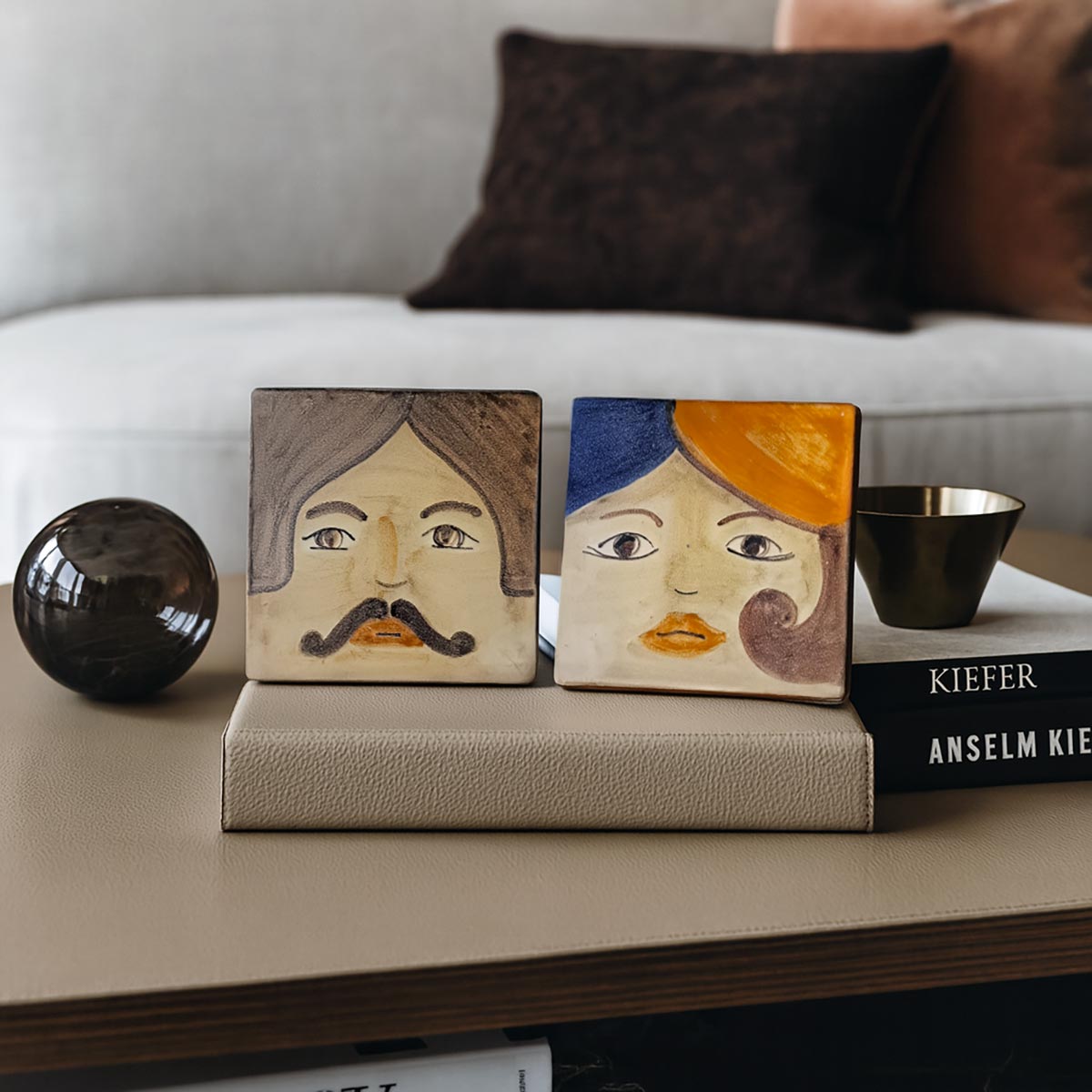 Realizzata come una coppia, ogni pezzo è unico e irripetibile. La maestria di Artema Galli si esprime nella finitura: i volti sono dipinti con una tecnica quasi "a spolvero" su un fondo color sabbia, creando una texture che invita al tocco. I contorni neri, netti, contrastano con i colori caldi—marrone, ocra e blu profondo—in un equilibrio che ricorda i maestri del Novecento.