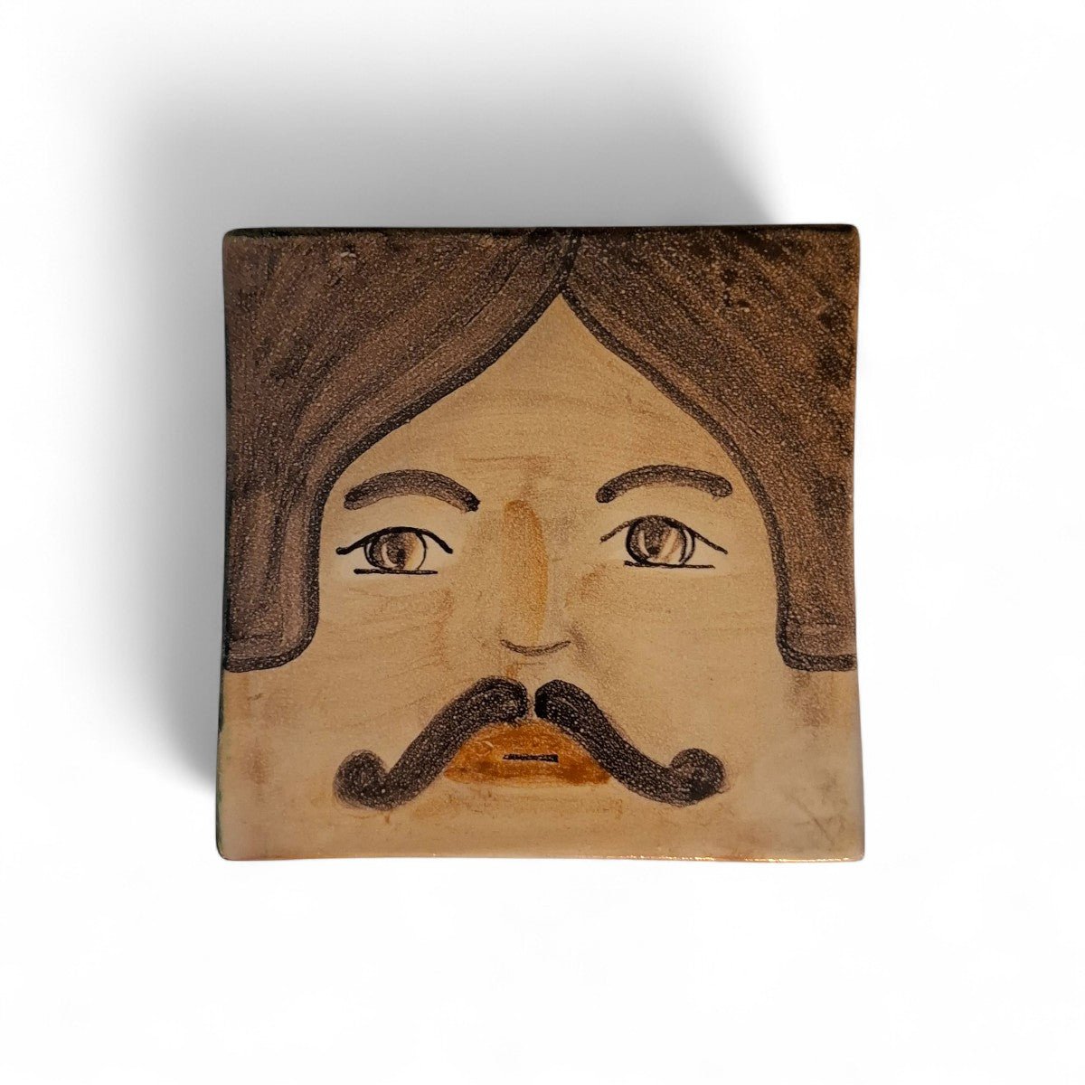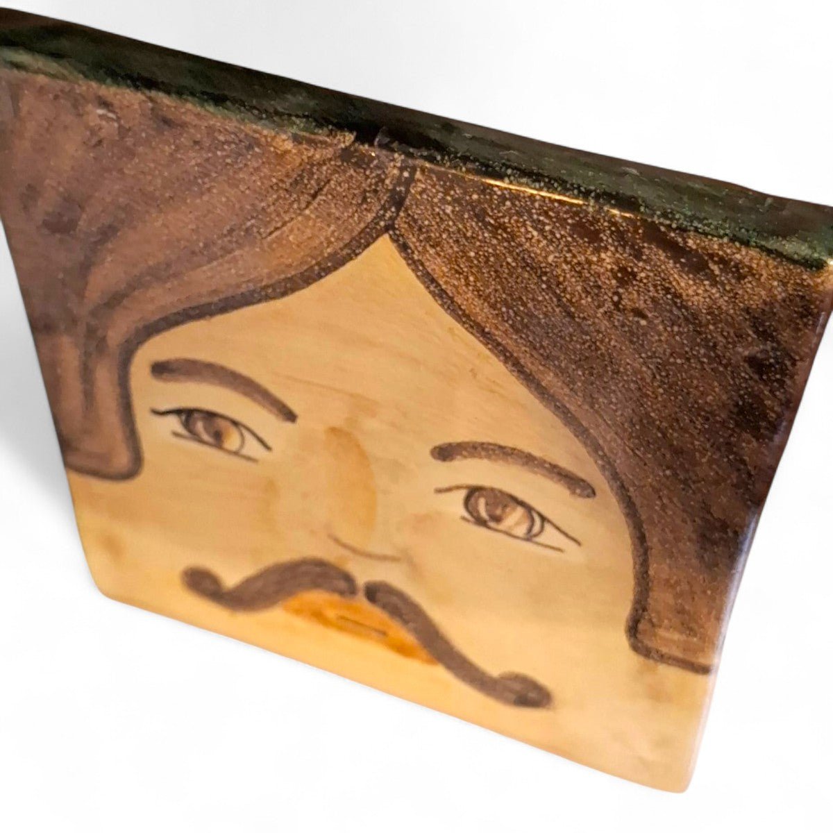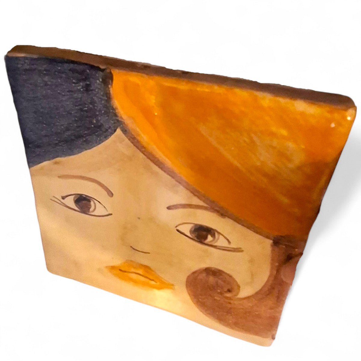 Realizzata come una coppia, ogni pezzo è unico e irripetibile. La maestria di Artema Galli si esprime nella finitura: i volti sono dipinti con una tecnica quasi "a spolvero" su un fondo color sabbia, creando una texture che invita al tocco. I contorni neri, netti, contrastano con i colori caldi—marrone, ocra e blu profondo—in un equilibrio che ricorda i maestri del Novecento.
